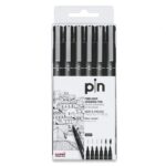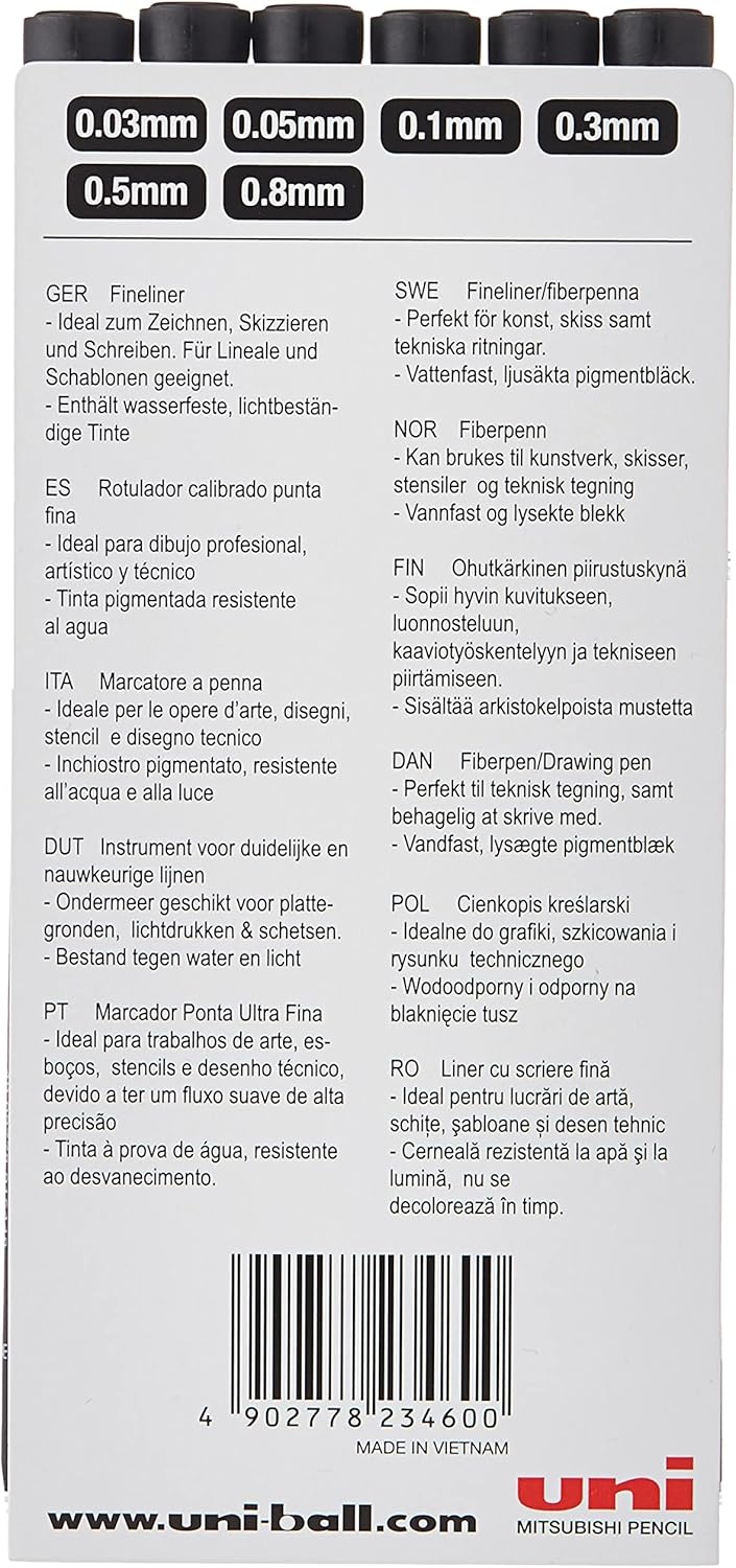 Set contains the following nib sizes: 0.03mm, 0.05mm, 0.1mm, 0.3mm, 0.5mm and 0.8mm., Uni Ball’s world-renowned Pin fineliner perfect for high precision., Uni’s high quality “Super Ink” is not only water and light resistant, but also “Tamper-Resistant”, meaning that the ink can not be washed of using chemicals and solutions used by people to fraudulently modify documents., With their huge range of nibs, the Uni Pin range is ideal for artists, illustrators, and designers of all ability levels., With their steel tips, the Pin range offers an extended lifespan when compared with cheaper imitations.